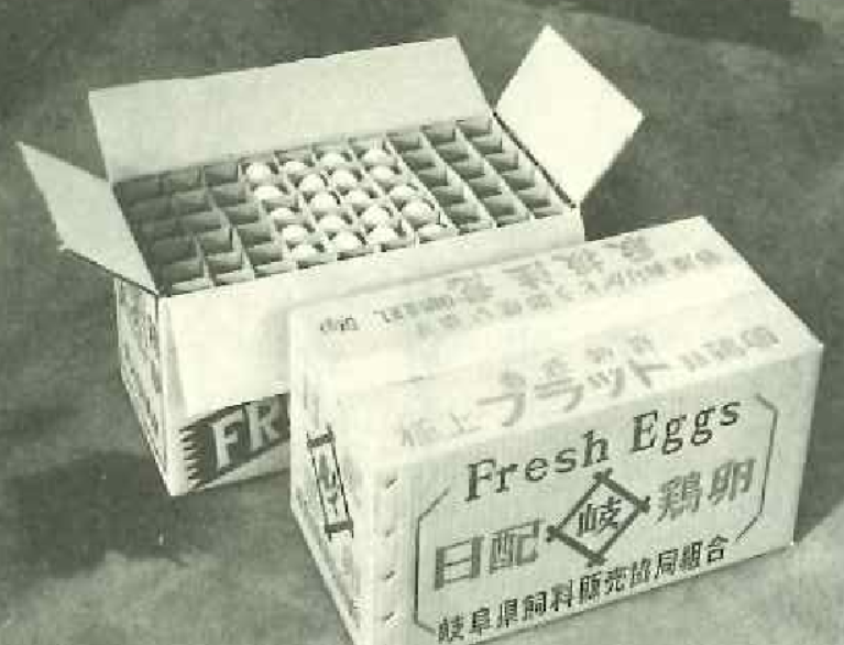 国内に於いて、戦後に簡易なパルプモールド抄造機を使いスピーカーコーンの生産再開に始まり、薬品アンプル、砲弾の信管の保護カバー等を米軍への納入をメインとして製造が開始されました。また1948年の神戸産業博覧会では鶏卵用、青果物用、工業用パルプモールドが出展され、通産大臣賞を受賞しています。 その後米軍が日本に進駐し、朝鮮戦争が勃発し戦地への鶏卵輸送がもみ殻に木箱といった包装形態の衛生的な改善要求がなされ、農林省に前章のフィラーフラットの変更要求が突き付けられました。農林省は生産希望者を募り、2社がフィラーフラットの量産を開始しました。(画像は当時の卵輸送のイメージ生成画像です)