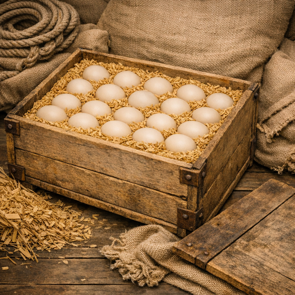 国内に於いて、戦後に簡易なパルプモールド抄造機を使いスピーカーコーンの生産再開に始まり、薬品アンプル、砲弾の信管の保護カバー等を米軍への納入をメインとして製造が開始されました。また1948年の神戸産業博覧会では鶏卵用、青果物用、工業用パルプモールドが出展され、通産大臣賞を受賞しています。 その後米軍が日本に進駐し、朝鮮戦争が勃発し戦地への鶏卵輸送がもみ殻に木箱といった包装形態の衛生的な改善要求がなされ、農林省に前章のフィラーフラットの変更要求が突き付けられました。農林省は生産希望者を募り、2社がフィラーフラットの量産を開始しました。(画像は当時の卵輸送のイメージ生成画像です)